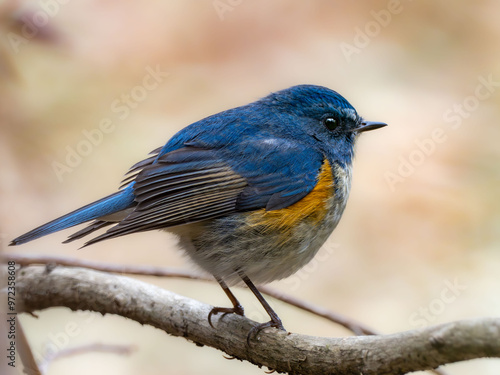 Naklejka premium 森の中の木陰で枝に留まって周りを見渡しているルリビタキの雄