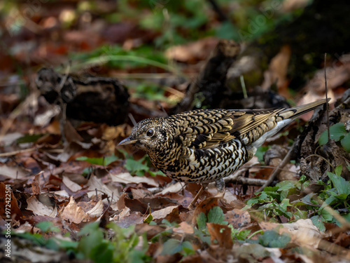 © STOCK THE WORLD, Fototapeta premium 枯れ葉をかき分けてエサを探しているトラツグミ