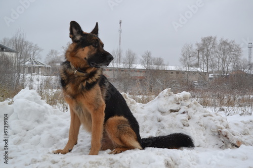 Naklejka premium Собака овчарка, охраняющая территорию в зимний день