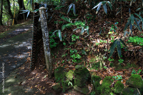 Fototapeta premium 日金山の苔むした仏塔のある小道の道標(日本、熱海市)