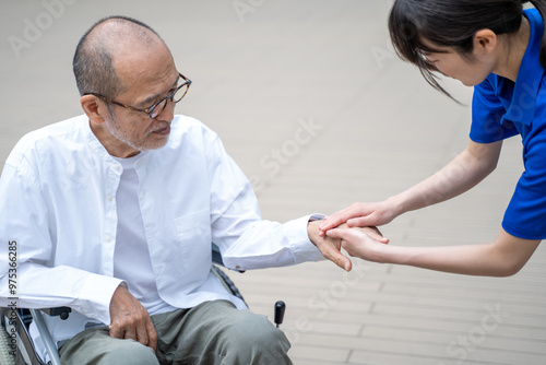 Obraz premium 車いすから立ち上がる介助をする介護施設スタッフ