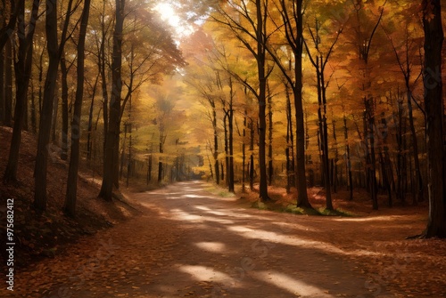 © sky studio, Obraz premium 秋の紅葉した美しい山道の風景、森林の風景