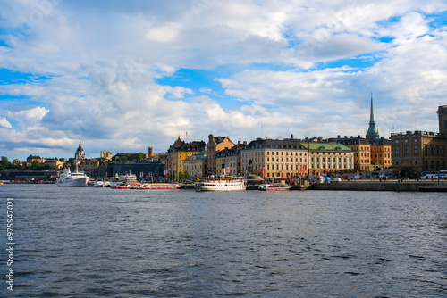 Obraz premium スウェーデン ストックホルムの湖と旧市街ガムラスタンの街並み
