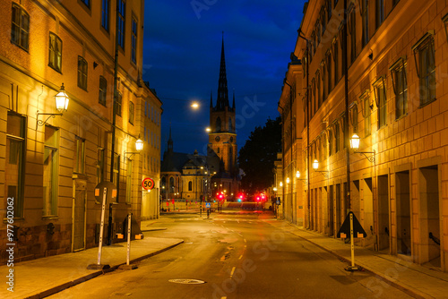 Fototapeta premium スウェーデン 夜のストックホルム、リッダーホルム教会を望める旧市街ガムラスタンの通り