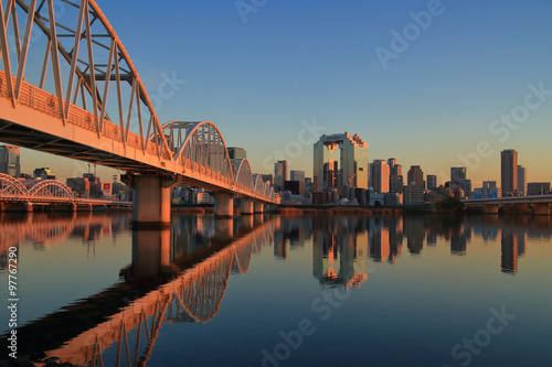 Obraz premium 夕暮れの淀川と大阪キタの街並み