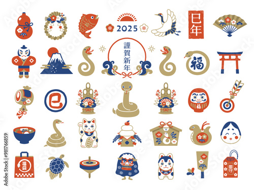 © Spiharu, Naklejka premium 2025年 巳年のシンプルでかわいい縁起物アイコンセット