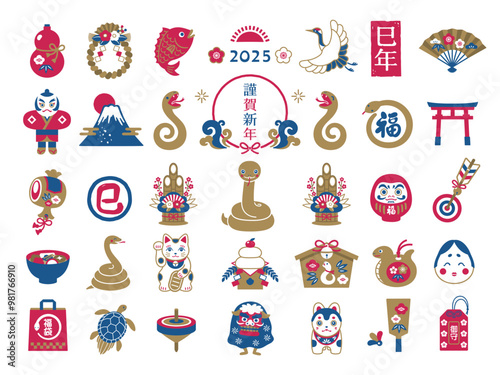 © Spiharu, Naklejka premium 2025年 巳年のシンプルでかわいい縁起物アイコンセット