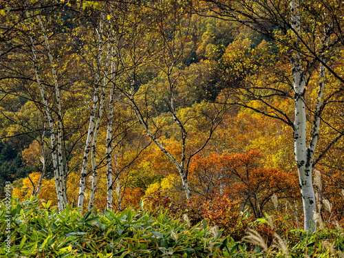 Naklejka premium 志賀高原、田ノ原湿原の遊歩道からの美しい紅葉の風景