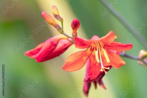 © MTBS PHOTO, Fototapeta premium 公園の野原で一際鮮やかに目立つ赤いヒメオウギズイセンの花