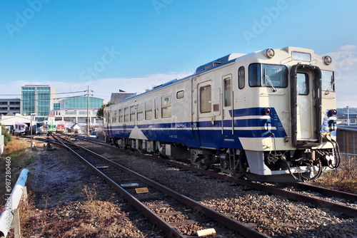 Obraz premium 加西市北条町の駅に停車する国鉄型ディーゼルカー