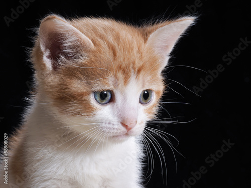 © kozorog, Obraz premium Портрет маленького котенка на черном фоне. Котенку 1 месяц. Кот белый с рыжим. Морда котенка крупно. Котенок милый, симпатичный