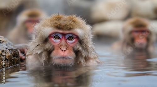 Naklejka premium 温泉に浸かる雪猿 - 日本の冬景色の中での禅のひととき