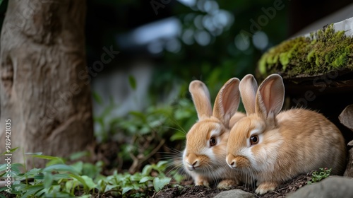 © chic designs, Fototapeta premium 日本の春:ポスターやカード用の伝統的な庭園を背景にしたふわふわのウサギ