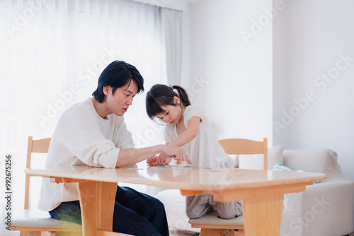 © maroke, Fototapeta premium パパと一緒にパズルゲームをする小さな女の子