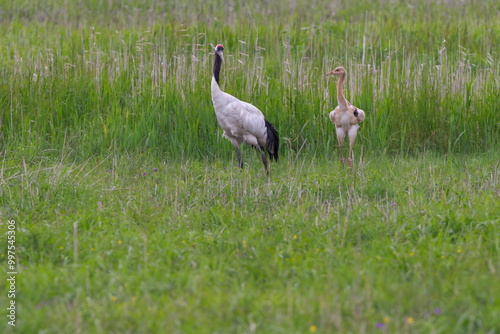 Naklejka premium タンチョウ鶴の親が子供の鶴に何かを伝えている