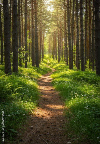 © HENRYF, Obraz premium Photo A Serene Forest Path Illuminated By Golden Sunlight and Lush Greenery