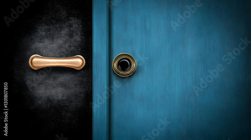 © Siasart Stock, Obraz premium Photo Background - Blue Door, Black Wall, Door Handle, Peephole