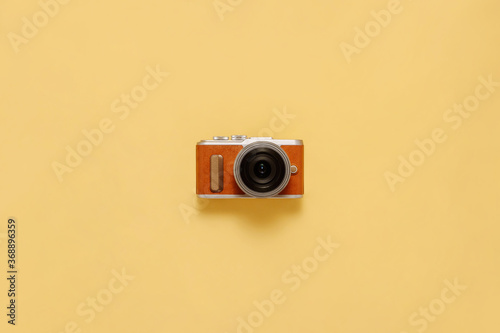 Fototapeta premium Photo camera on yellow background with drop shadow flat lay. Travel or...