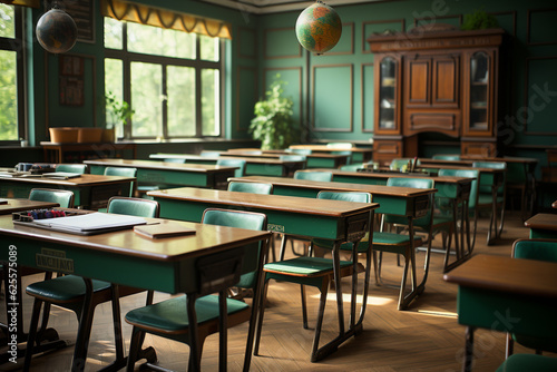 Obraz premium Photo classroom interior with school desks chairs and green board empty...