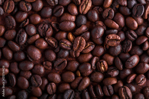 © Olena, Fototapeta premium Photo closeup of coffee beans. Rusty background. Copy space.