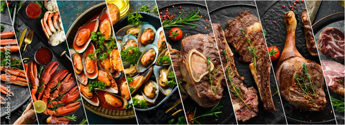 Obraz premium Photo collage: meat, steaks and seafood, photo banner.