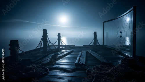 © Vicentia, Obraz premium photo depicting an eerie, atmospheric scene on what appears to be a wooden dock or the deck of an old ship at night, under a bright moon