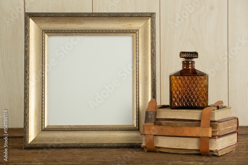 © vectorfusionart, Fototapeta premium Photo frame, perfume and book stack on table