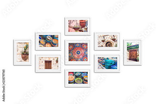 © Sun-flower, Fototapeta premium Photo frames collage with street photography, pictures of old city. White frameworks mock up