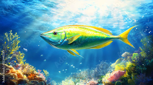 © Thiago, Fototapeta premium Photo image of a mahi-mahi fish swimming in the bright blue ocean, surrounded by vibrant coral reefs, schools of tropical fish, and a sunny underwater landscape. Seafloor. Illustration