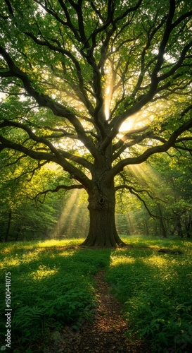 © Johnny, Fototapeta premium Photo Majestic Tree with Sunlight Shining through Forest Path Green Foliage