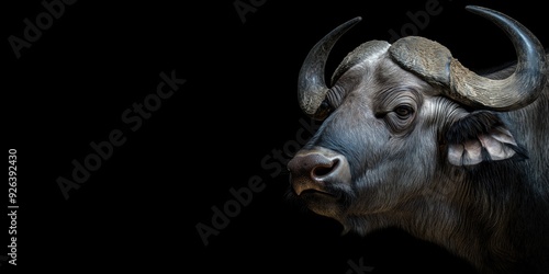 © Mark G, Naklejka premium Photo of a buffalo isolated against a black background, emphasising the buffalo's majestic features. Wildlife and conservation concept, space for copy.