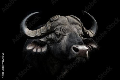 © Mark G, Naklejka premium Photo of a buffalo isolated against a black background, emphasising the buffalo's majestic features. Wildlife and conservation concept, space for copy.