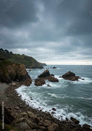 © KarenJ, Fototapeta premium Photo of a Cloudy Seascape with Rocks Coast and Waves in a Dramatic Scene