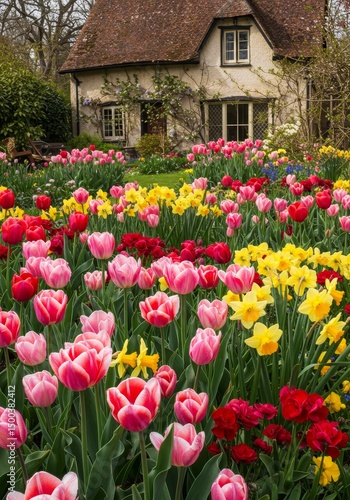 © Daniel, Fototapeta premium Photo Of A Colorful Garden With Tulips And A Cottage On A Sunny Day