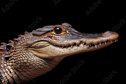 Obraz premium Photo of a crocodile isolated against a black background, emphasising the crocodile's majestic features. Wildlife and conservation concept, space for copy.