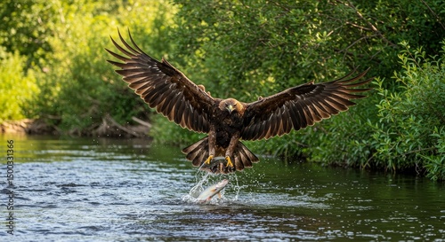 © Cahyani, Fototapeta premium Photo of a Golden Eagle in Flight Catching a Fish Above a River in Sunlight