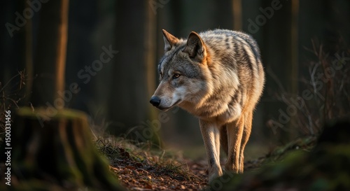 Fototapeta premium Photo Of a Gray Wolf in a Forest Environment with Sunlight and Blurred...