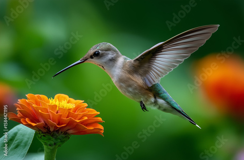 © saira, Fototapeta premium Photo of a hummingbird flying near a zinnia flower, with a green background and blurred edges