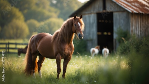 © AugmentArt, Fototapeta premium Photo of a majestic brown horse elegantly positioned in tall grass next to a structure.