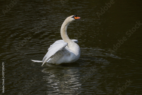 Fototapeta premium photo of a male Mute swan stretching his wings on the water