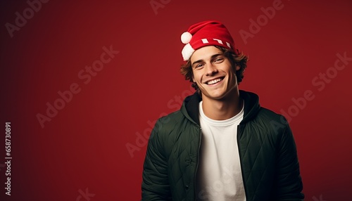 Fototapeta premium Photo of a man wearing a Santa hat in front of a vibrant red wall created...
