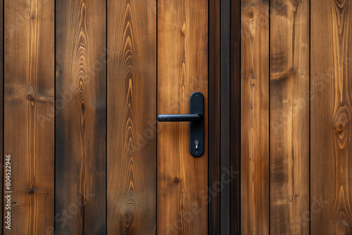 Fototapeta premium Photo of a modern wooden door with a black handle on a wooden wall, close up....