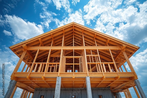 © KADER, Fototapeta premium Photo of a new wooden house frame under construction on a clear sunny day.
