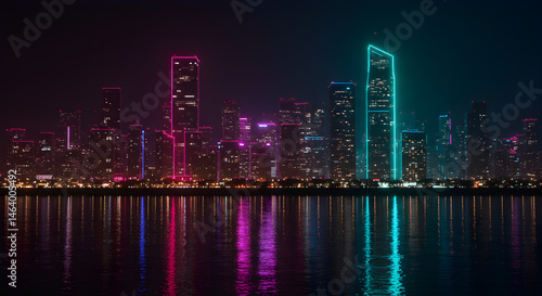 Naklejka premium Photo of a Nighttime Cityscape Skyline with Neon Lights and Reflections