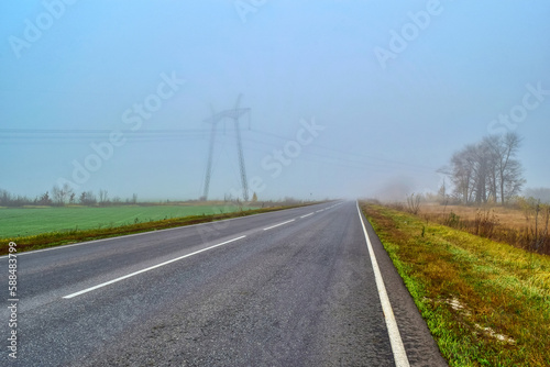 © Светлана Беляева, Fototapeta premium Photo of a road with a power line in the fog