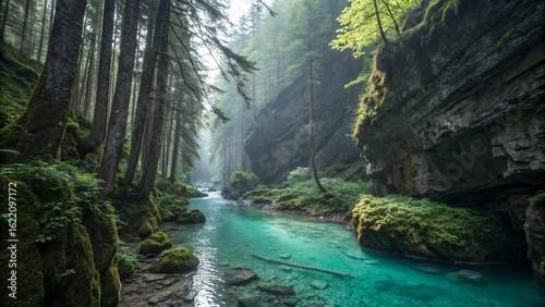 Naklejka premium Photo of a serene turquoise river flows through a lush green forest canyon with sunlight filtering through the trees