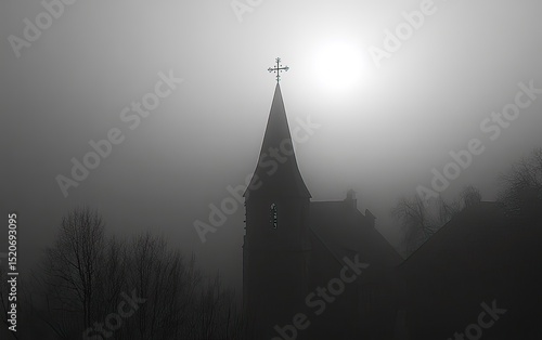 © Fathor, Fototapeta premium Photo of a silhouette church steeple with two crosses on top, a sunrise in the background, and a misty sky.