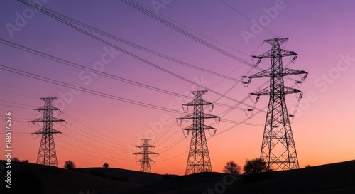 Fototapeta premium Photo of a silhouette of power lines against a vibrant sunset sky, showcasing the infrastructure and technology of electricity transmission and the high voltage cables that supply energy