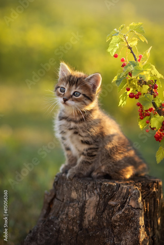 Fototapeta premium Photo of a small kitten near a red currant bush.