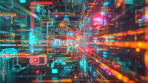 Obraz premium Photo of a smart greenhouse complex, where neural networks analyze sensor data and control heating, cooling and ventilation systems to create an ideal microclimate. ::3 neon ::3 --no text --ar 16:9 -